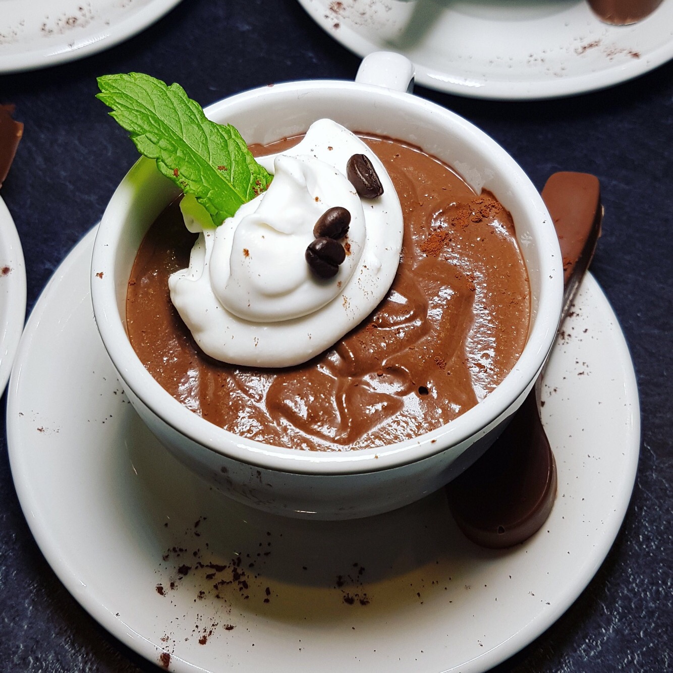 Spoon a dollop of cream on top and add a mint leaf and a few coffee beans to decorate.
