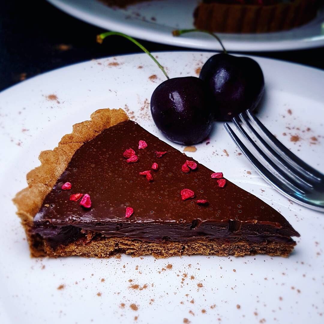 Keep the tart in the fridge and serve chilled. I decorated the top with freeze dried raspberries.